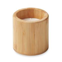 Vanilla-scented wax candle in a bamboo holder. Weighs 160 grams. Enjoy up to 30 hours of burn time.