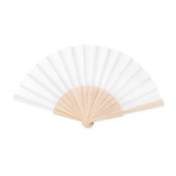 Manual fan made of wood and polyester.