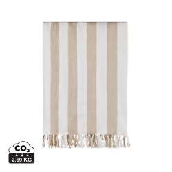 This beach towel features a classic two-tone striped pattern with fringes on the short edges. Made from a lightweight blend of 200 g/m², it combines the comfort of cotton with the quick-drying benefits of polyester. Measuring 80x180 cm, it’s perfect for the beach or poolside lounging.