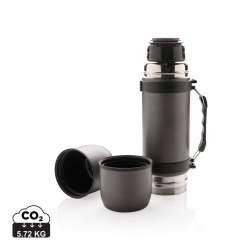 This bottle comes equipped with a convenient handle and a shoulder strap for easy carrying. Plus, it includes two cups for sharing your favorite beverages on the go.