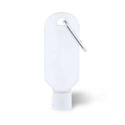30 ml refillable bottle. Transparent body with dispenser and safety cap. Convenient to carry with its carabiner.