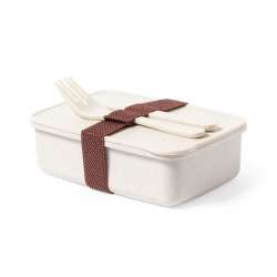 This sturdy container features a secure elastic band, along with a fork and knife for your convenience.