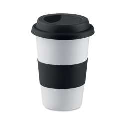 Introducing our sleek ceramic mug with a silicone band and lid.