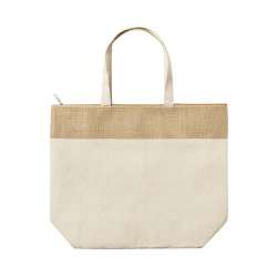 It features a laminated jute top and sturdy cotton handles. The main compartment zips shut securely, while a metal handle adds convenience.
