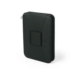 This sleek organizer combines durable 300D polyester and leather materials. It features a built-in wireless charger on the cover and a smartphone holder for convenience.