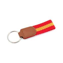 Keychains made from durable polyester. Each features a vibrant Spanish flag on a sturdy cord, complemented by a brown faux leather reinforcement.