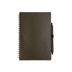 - Set includes a notebook and pen - Notebook features ring binding with soft fiber covers - Made with 80 lined sheets - Pen is a push-button ballpoint with a brown fiber body and blue ink - Unique coffee fiber design printed on both the notebook and pen - Packaged individually in a recycled bag - Ideal for note-taking, journaling, and everyday use