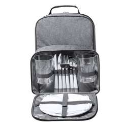 Designed for two, it features a separate pocket for secure storage. You’ll find everything you need inside: 2 glasses, 2 knives, 2 spoons, 2 forks, 2 plates, and 2 napkins.