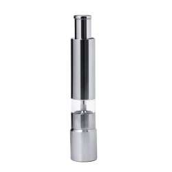 Manual salt and pepper mill made from aluminum. Perfect for adding your favorite spices with a convenient push-button grinder.